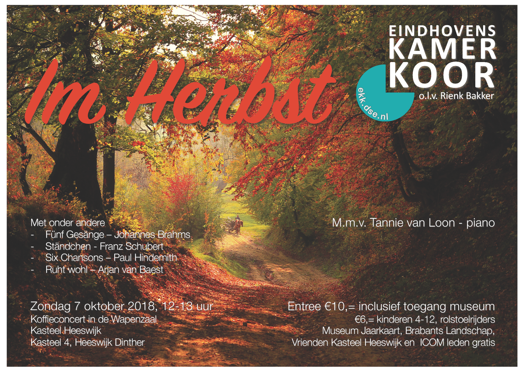 7/10/2018Kasteel Heeswijk, Kasteel 4, Heeswijk-DintherIm HerbstHet Eindhovens Kamerkoor brengt in dit programma muziek ten gehore waarin diverse emoties rondom de herfst de boventoon voeren. Gevoelens van melancholie, verdriet, maar ook juist van troost en uitzicht. Met medewerking van Tannie van Loon – piano Onder leiding van Rienk Bakker |