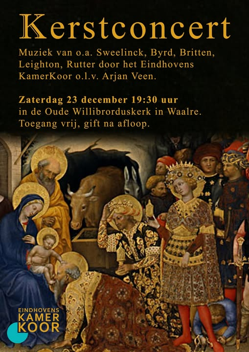 23/12/2018Mariakerk (Boterkerkje), Vrijthof, OirschotA Carol for a KingIn een programma getiteld 'A Carol for a King’ laat het Eindhovens Kamerkoor diverse werken rondom kerst horen. Met de focus op Engeland (hét land van de carols) komen de componisten Parsons, Byrd, Howells en Rutter voorbij. Ook het mystieke O Magnum Mysterium van Morten Lauridsen staat op het programma. Enkele koorleden zullen instrumentaal van zich laten horen en een muzikale verrassing aan het eind zorgt ervoor dat u vrolijk de kerstdagen tegemoet gaat. Onder leiding van Rienk Bakker |
